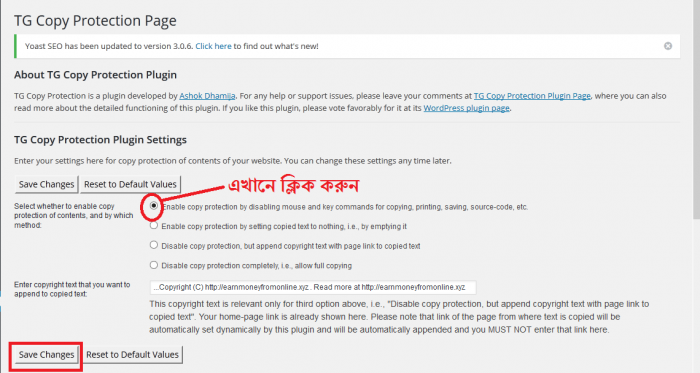 তার পর প্রথম চেকবক্সটিতে চেকমার্ক দিয়ে save changes বাটনে ক্লিক করলেই আপনার সাইটটি কপিরাইট প্রটেক্টেড হয়ে যাবে।