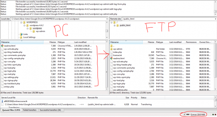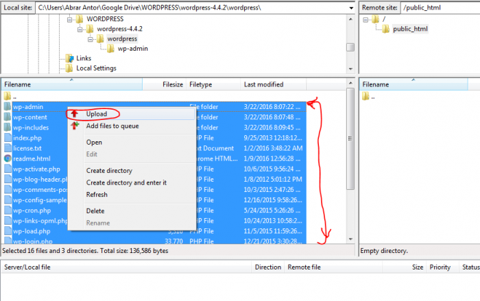 ৬। তারপর ফাইল টা unzip করে filezilla software এ সেই path এ যান নিচের ছবির মত অল সিলেক্ট[ctrl+A] করে upload করুন। [মনে রাখবেন, upload করার সময় ডান ্সাইডে যেন নিচের ছবির মতই থাকে]