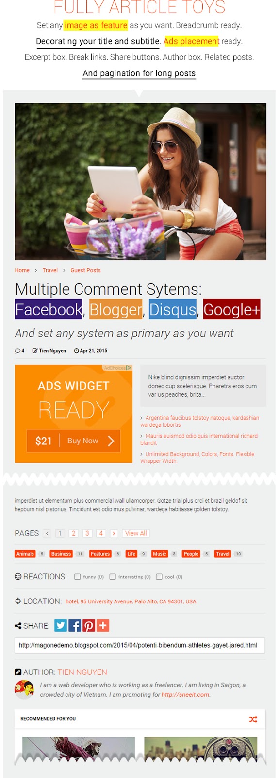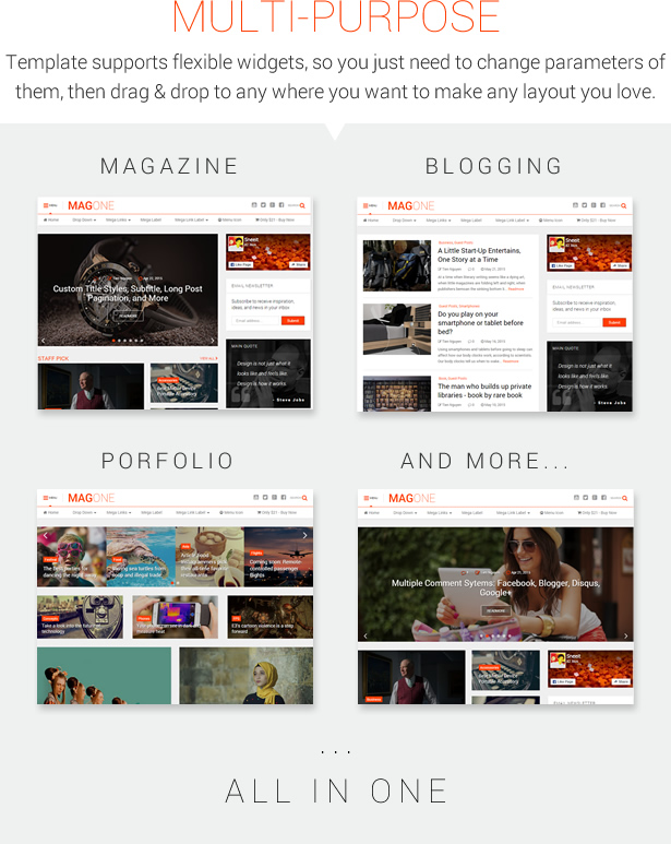 MagOne template is flexible and responsive magazine template for Blogger/Blogspot websites. Drag and drop to built a magazine website in minute.