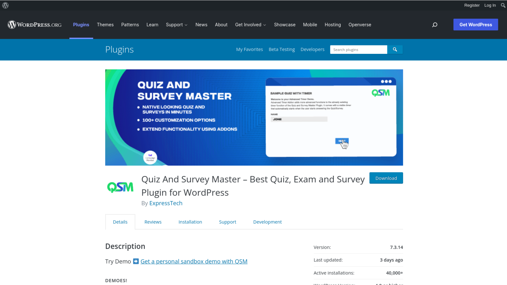 Quiz And Survey Master প্লাগ-ইনটি ইন্সটল করে আপনি অনলাইন কুইজ ওয়েবসাইট এবং সার্ভে ওয়েবসাইট তৈরি করে ফেলতে পারবেন। এতে রয়েছে multiple choice, true and false, open answer, drop down, fill in the blank এর মত কুইজ ব্যবস্থা। কুইজ তৈরি করে সেগুলো আপনি ইমেইলেও পাঠাতে পারেন।