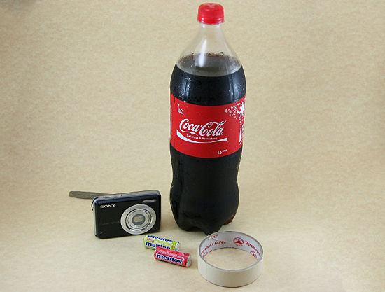 ৬-৭ টা mentos স্প্রাইট অথবা কোকাকোলা ভর্তি বোতলে (১ লিটার অথবা ২৫০ মিলি. ও নিতে পারেন) ঢুকিয়ে দিন, বোতলের মুখ কিন্তু লাগাবেন না, এরপর বোতল টা উল্টিয়ে (খোলা মুখ নিচের দিকে)মাটিতে রাখুন অথবা সোজা রাখেন।