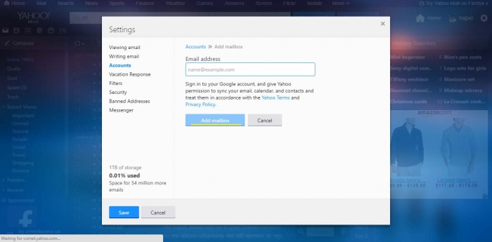 ২. ওইখানে ক্নিক করলে নিচের চিত্রের মত একটি উইনডো পাবেন। সেখান থেকে Accounts ক্লিক করুন। ক্লিক করলে Email address বসানোর জন্য একটি ফাকা ঘর পাবেন। ওইখানে আপনার Gmail, Outlook, Aol মেইল বসিয়ে Add mailbox এ ক্লিক করুন।