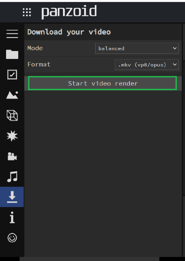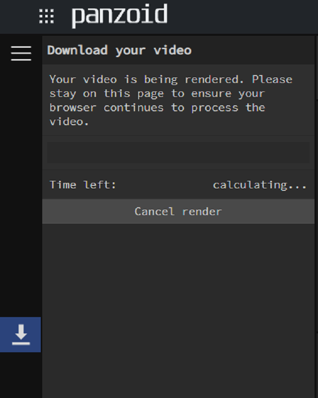সাইডবার এ থাকা ডাউনলোড আইকন এ ক্লিক করুন। আপনার সামনে ডাউনলোড করার একটি উইন্ডো ওপেন হবে। এখানে সেটিং গুলো যেভাবে আছে সেভাবে রেখে Start video render বাটনে ক্লিক করুন।