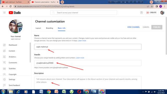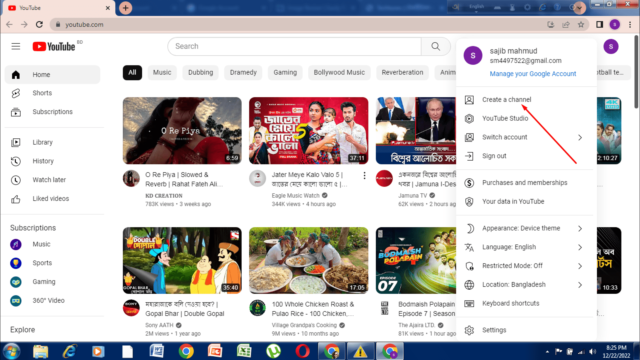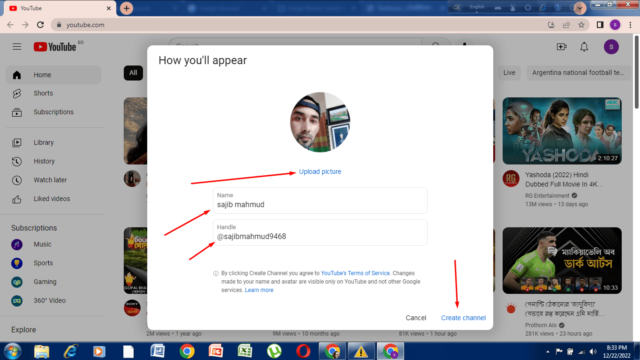 এরপর ইউটিউব ডট কম এর সবার উপরে ডানে প্রোফাইল পিকচারে ক্লিক করে ক্রিয়েট চ্যানেলে ক্লিক করবেন। এরপর আপনি আপনার চ্যানেলের নাম দিবেন এবং চ্যানেলের নামের সাথে মিলিয়ে রেখে একটি প্রোফাইল পিকচার দিবেন। এরপর আপনি হ্যান্ডেল অপশনটি দেখতে পাবেন। এখানে হ্যান্ডেল অপশনে অটোমেটিক ইউটিউব হ্যান্ডেল আইডি দিয়ে দেয় এরপর ক্রিয়েট চ্যানেলে ক্লিক করবেন।