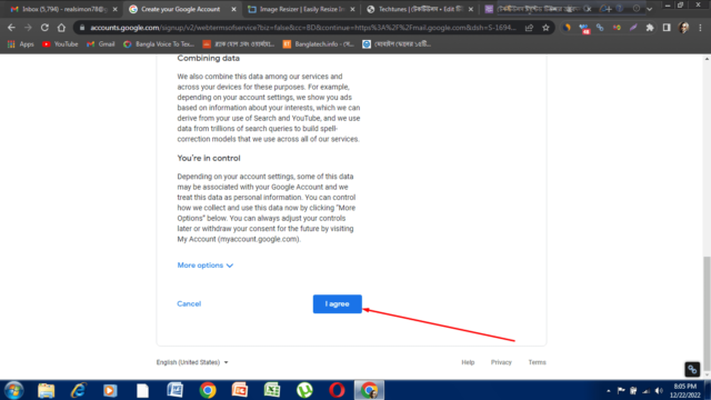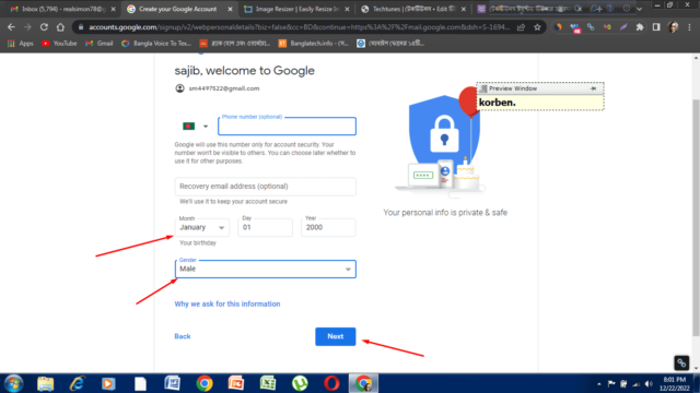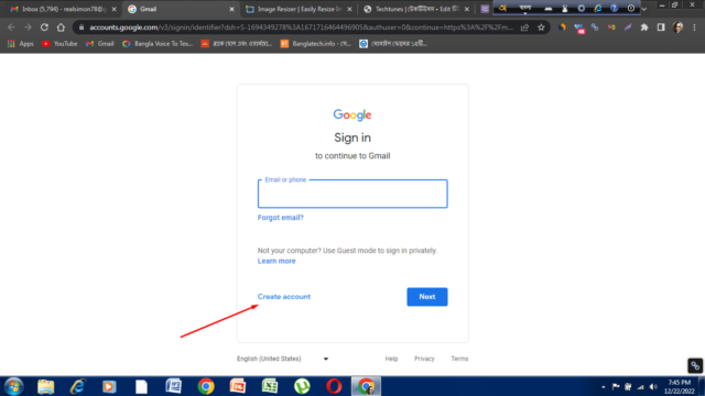 চ্যানেল খোলার জন্য প্রথমেই আপনার একটা জিমেইল অ্যাকাউন্ট লাগবে। যদি না থাকে তাহলে জিমেইল ডট কমে গিয়ে একটা জিমেইল একাউন্ট খুলতে হবে। প্রথমে জিমেইল ডট কম এ এ প্রবেশ করবেন। তারপর ক্রিয়েট একাউন্ট এ ক্লিক করবেন। তারপর ফার্স্ট নাম, লাস্ট নাম, ইউজার নাম এবং পাসওয়ার্ড এবং কনফার্ম পাসওয়ার্ড দিয়ে নেক্সট এ ক্লিক করবেন। এরপর মোবাইল নাম্বার ও রিকভারি ইমেইল না দিলেও চলবে। আপনি পরবর্তীতে চাইলে মোবাইল নাম্বার এবং রিকভারি ইমেইল যোগ করতে পারবেন। এখন আপনার জন্ম তারিখ এবং লিঙ্গ সিলেক্ট করে নেক্সট এ ক্লিক করবেন। এরপর প্রাইভেসি এবং টার্মগুলো ভালোভাবে পড়ে আই এগ্রি বাটনে ক্লিক করবেন। তারপর সরাসরি আপনাকে একটি জিমেইলের ইনবক্সে নিয়ে যাওয়া হবে। এটি আপনার ইমেল আইডি। আপনার ইনবক্সে গুগলের যে মেইলটি আসবে সেটির সবার নিচে কনফার্ম বাটনে ক্লিক করবেন। নিচে দেওয়া স্ক্রিন শটগুলো ধাপে ধাপে ফলো করুন।