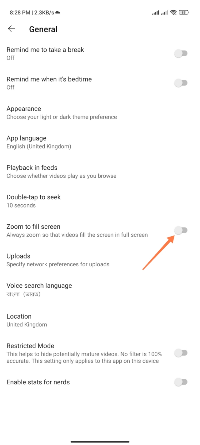 ৪. এবার আপনারা Zoom to fill Screen অপশনে ক্লিক করে অপশন টি অন করে দিন।